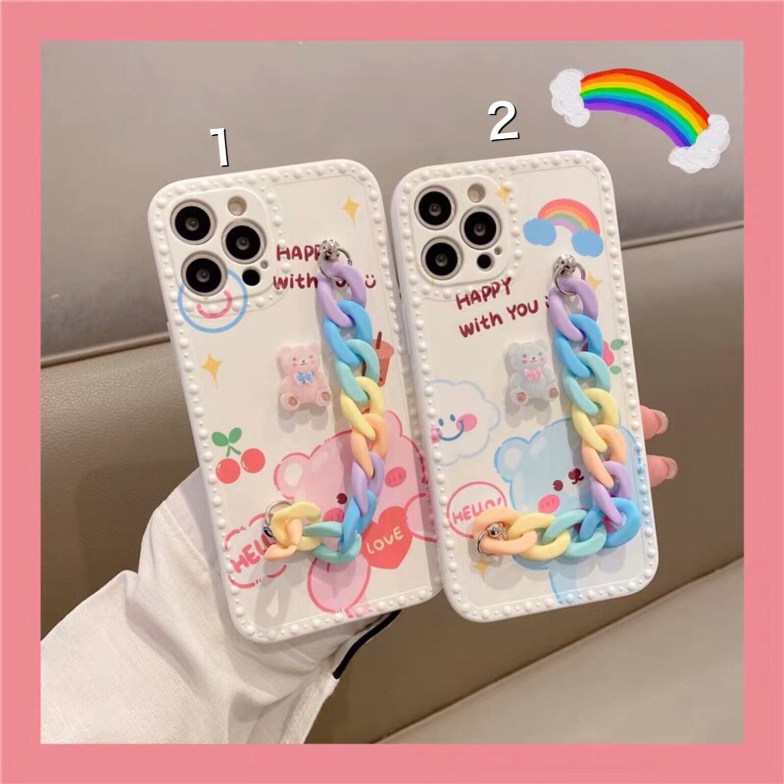 iPhoneケース iPhone13 iPhone12 キーリング チェーン くま さくらんぼ チェリー 虹 雲 英字 英語 英文 2159