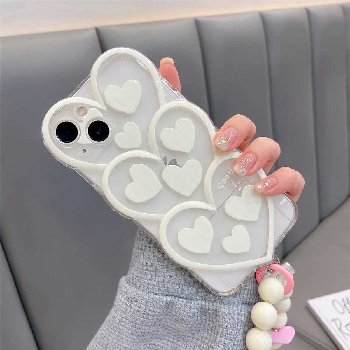 iPhoneケース iPhone13 iPhone12 ビーズ 持ち手付き ハート 3連 白 かわいい スマホケース おしゃれ 韓国 2267