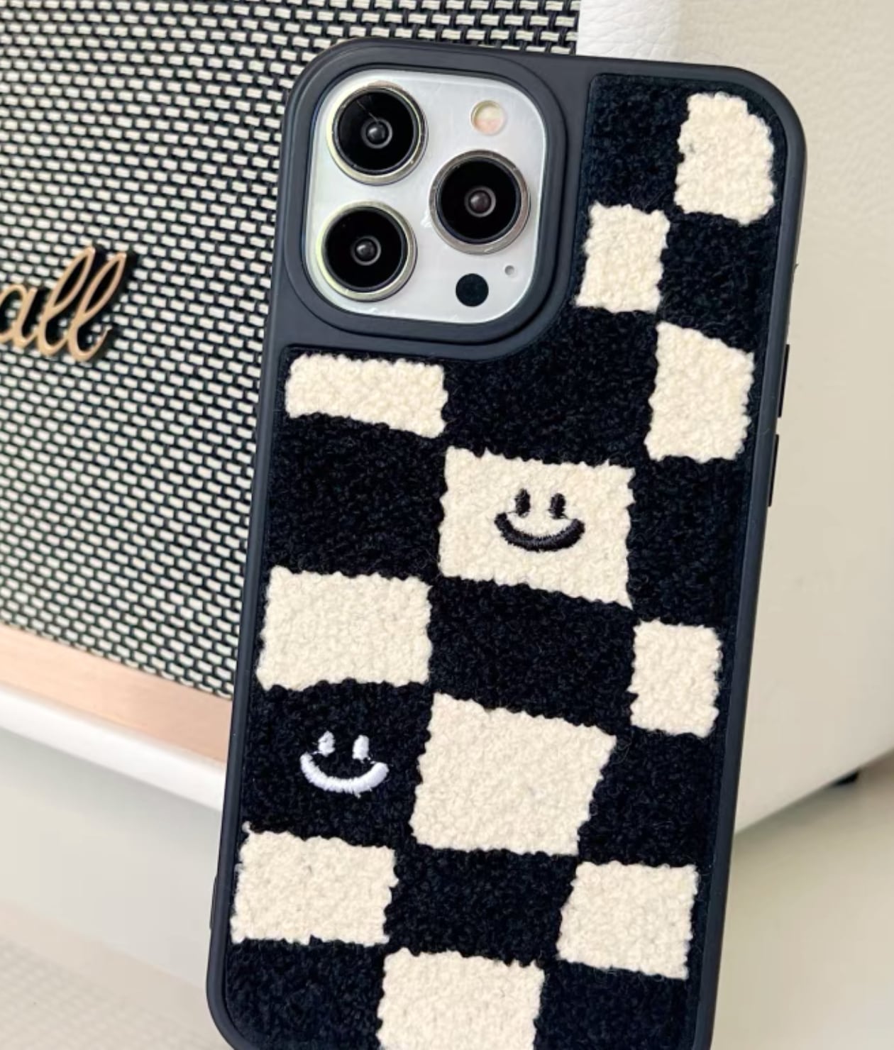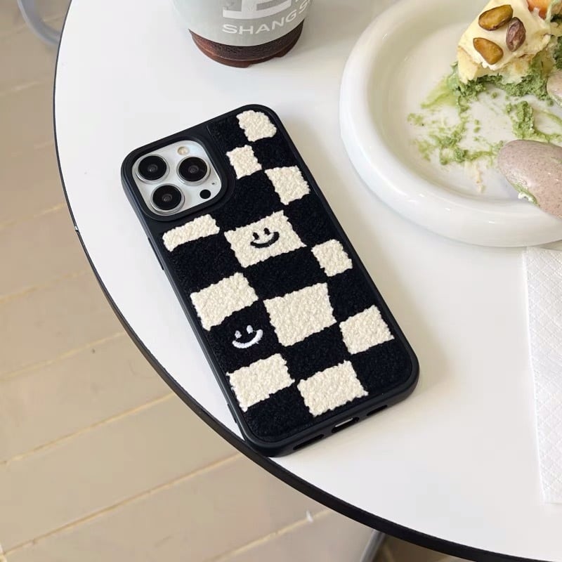 iPhoneケース iPhone14 iPhone13 モコモコ 秋冬 にこちゃん スマイル チェック スマホケース おしゃれ 韓国 2311